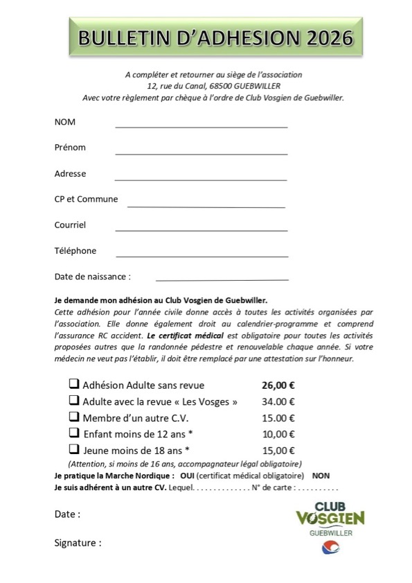 Merci de bien vouloir régler par chèque bancaire établi à l’ordre du Club Vosgien de Guebwiller et à adresser au siège :