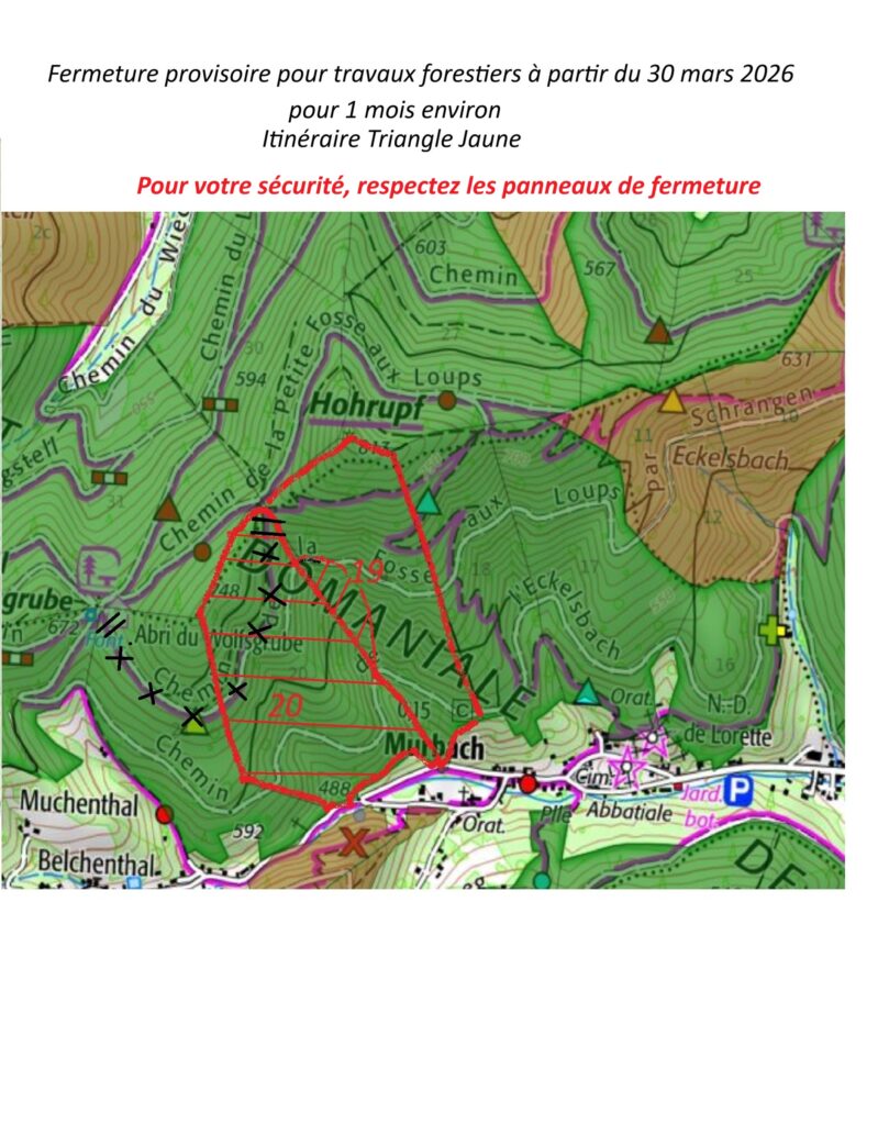 Si vous rencontrez ce panneau, soyez très attentifs, des travaux forestiers sont ou vont être réalisés. Pour votre sécurité, l’équipe de balisage pose ce panneau à chaque extrémité du sentier concerné.